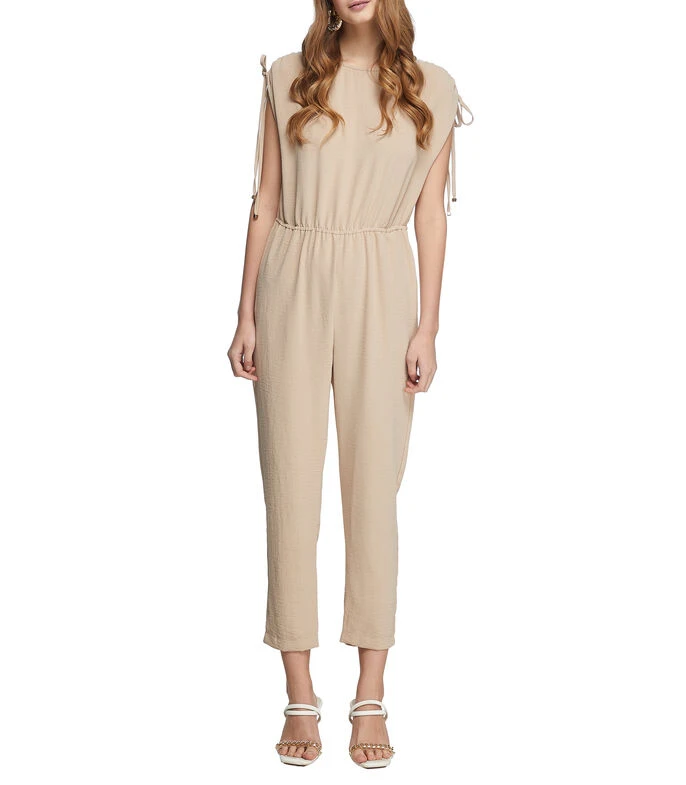 Jumpsuit Tattoo de corte recto en tejido de punto, diseño sólido, cuello oval, hombros anchos con cintas de ajuste, elástico en cintura y bolsillos en costados.