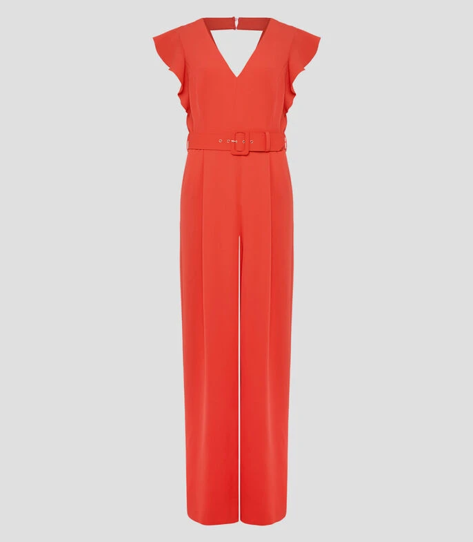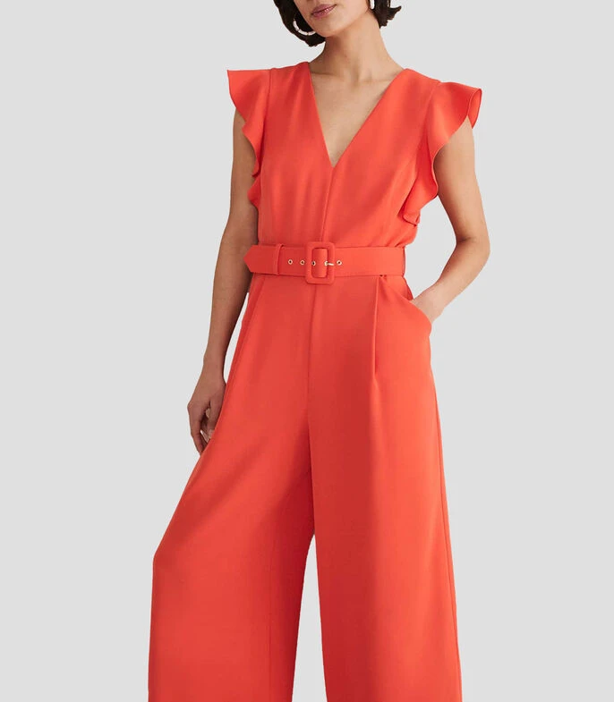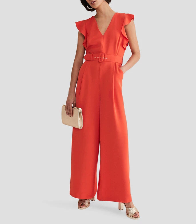 Jumpsuit Phase Eight Kallie de corte wideleg en tejido de punto, cuello V y sin mangas; Un jumpsuit de ocasión contemporánea atemporal. Nuestro jumpsuit Kallie presenta un escote en V femenino que está enmarcado por volantes que detallan un detalle recortado en la parte posterior y cae a una silueta de pierna ancha. Use tacones dorados y un bolso de mano a juego para su próximo evento especial.