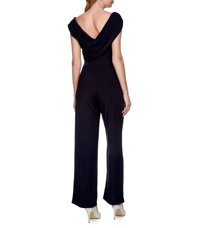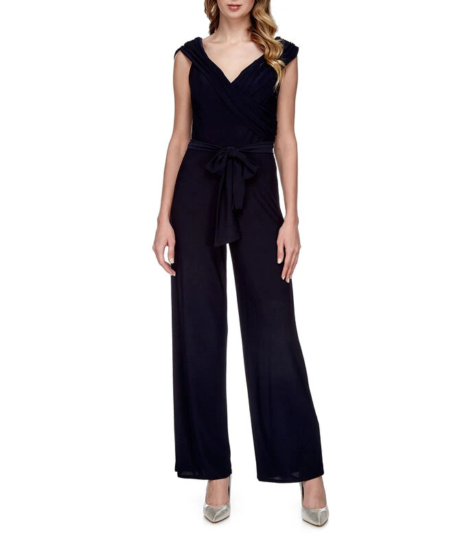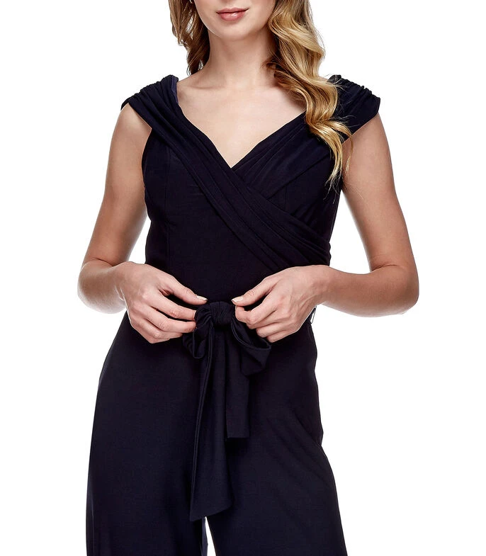 Jumpsuit Massima de fiesta de corte ajustado en tejido de punto, sobreposición a tono en pecho, cintillo para anudar y cierre en costado.