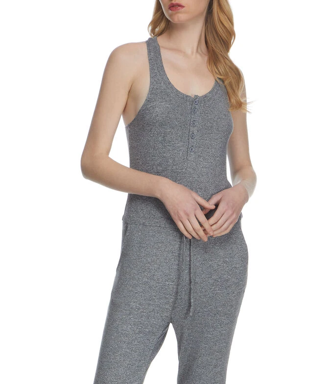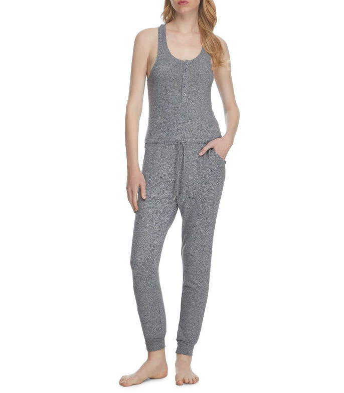 Jumpsuit pijama UNWIND by Epsilon de corte recto en tejido de punto con cuello ovalado, media botonadura a tono y jareta en cintura.