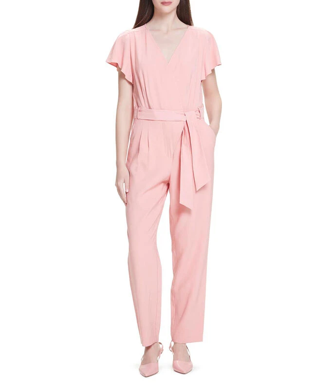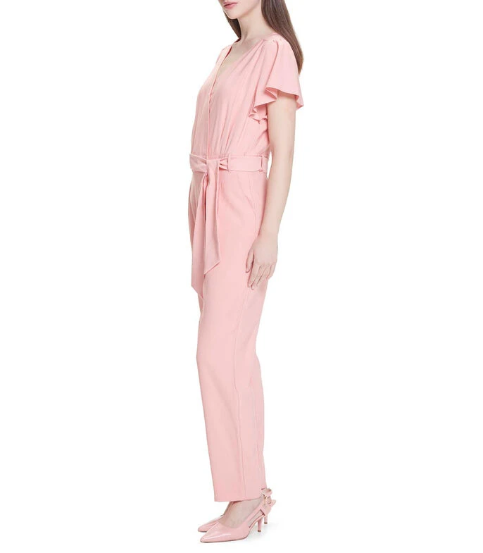 Jumpsuit Julio de corte recto en tejido de punto liso con diseño envolvente, bolsillos diagonales, banda en cintura y detalle de escarolas sobre las mangas.