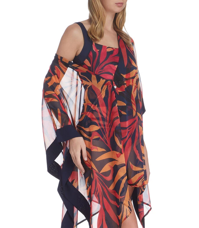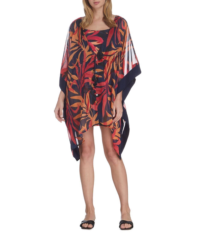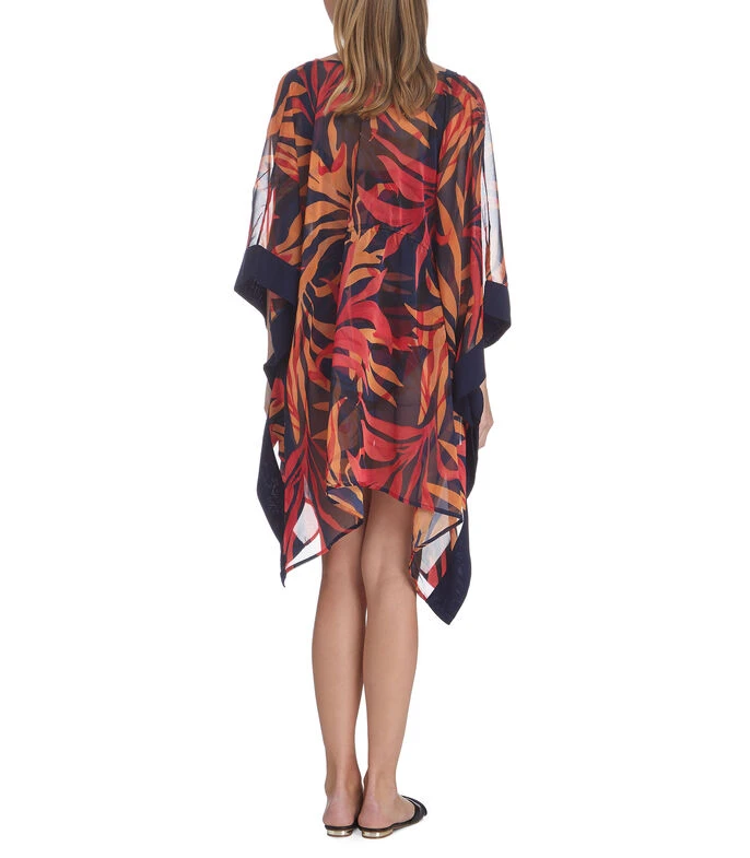 Kaftan Barocco en tejido plano con diseño decorativo de hojas, cuello V con botonadura al frente, detalle de cintas de ajuste, manga corta y borde a contraste.