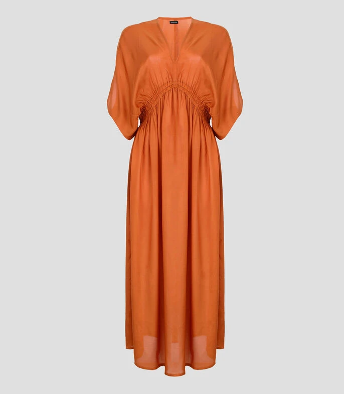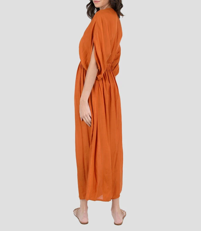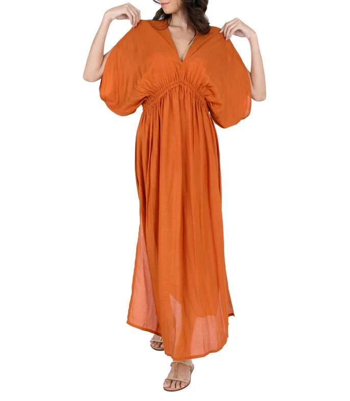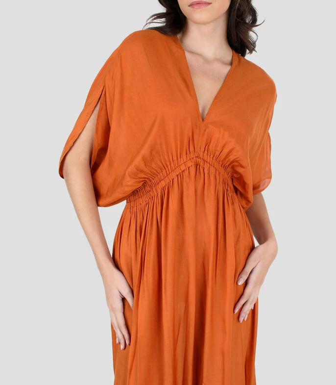 Kaftan Zingara en tejido de punto con elástico en cintura, detalles plisados y manga corta.