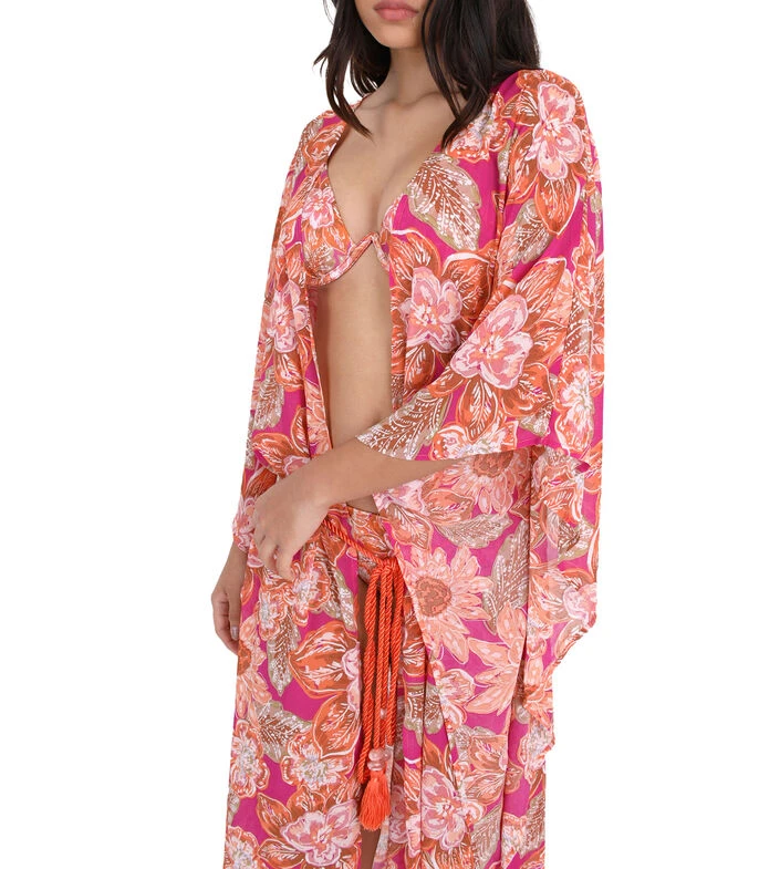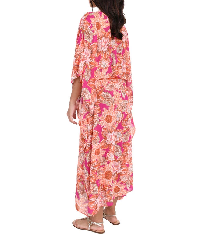 Kaftan de playa Zingara en tejido plano con print floral, manga corta y cinta de amarre a juego.