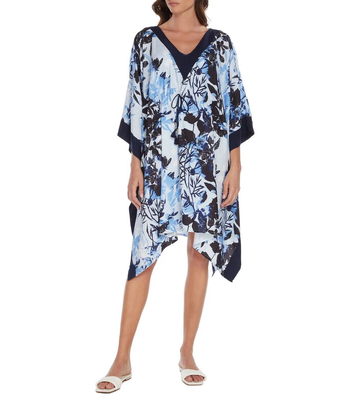 Kaftan de playa Barocco en tejido de punto con estampado floral y silvestre, lazo ajustable a la cintura y bordes a contraste.