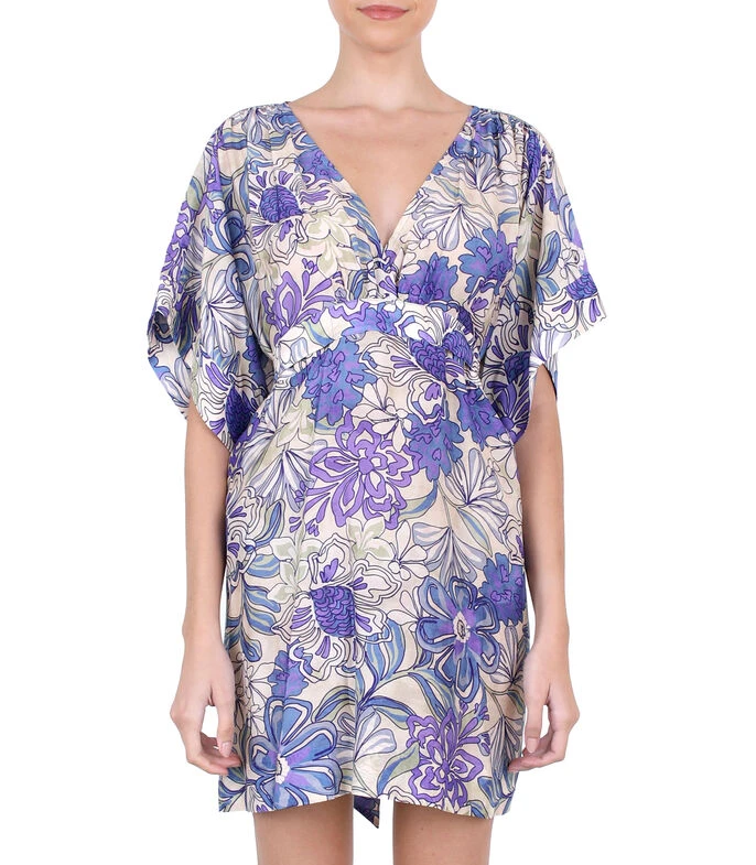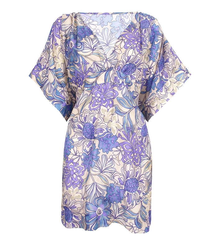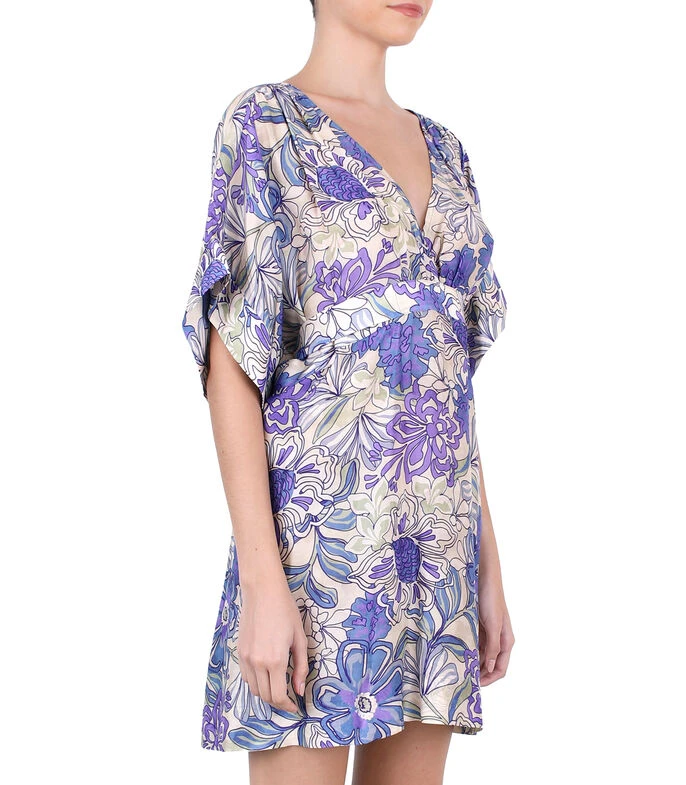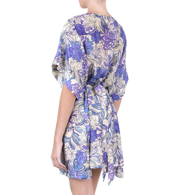 Kaftan Zingara corto en tejido de punto con estampado floral y lazo ajustable en cintura posterior.