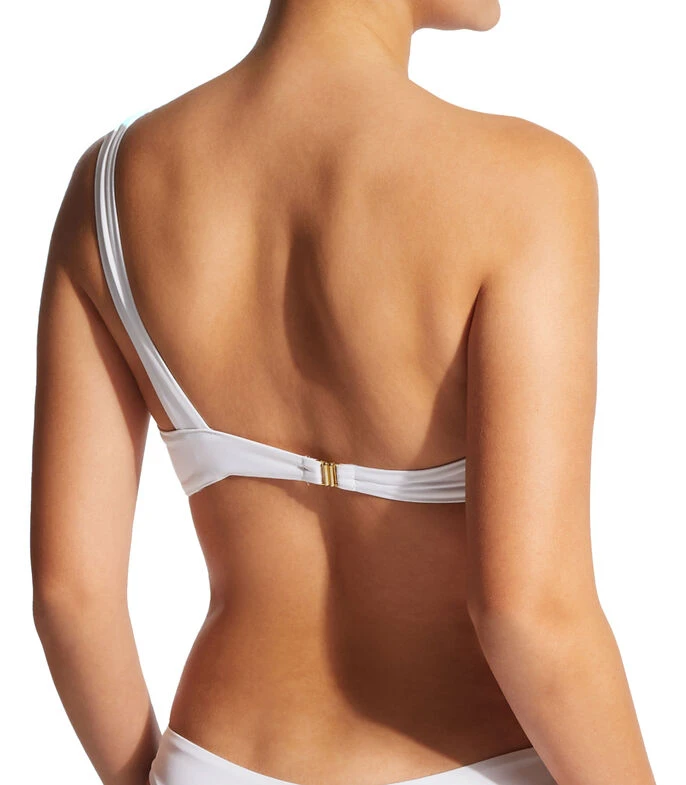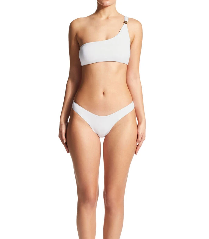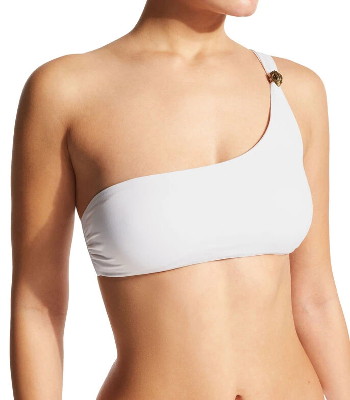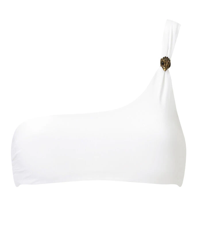 Bikini top Kurt Geiger Kensington en tejido plano con escote asimétrico, un solo tirante, ave metálica a contraste y broche en espalda. Con un hombro que presenta una cabeza de águila de latón envejecido y cristales.