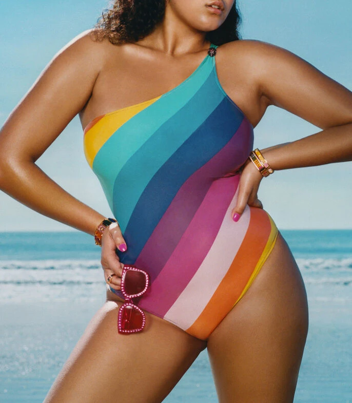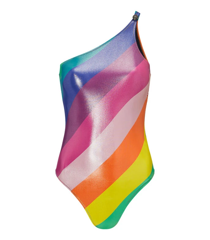 Maillot Kurt Geiger en tejido plano con diseño de franjas en diagonal, tirante mediano con adorno de la marca y espalda clásica.