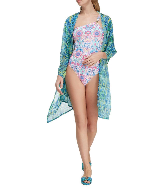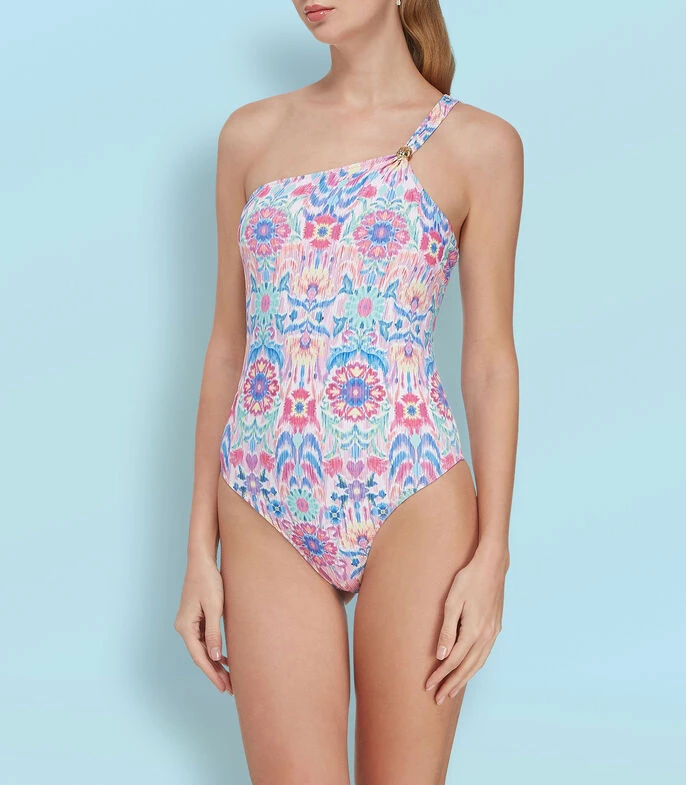 Traje de baño Maillot Kurt Geiger en tejido plano con diseño de flores en mosaico, tirante mediano y adorno metalizado de la marca a contraste.