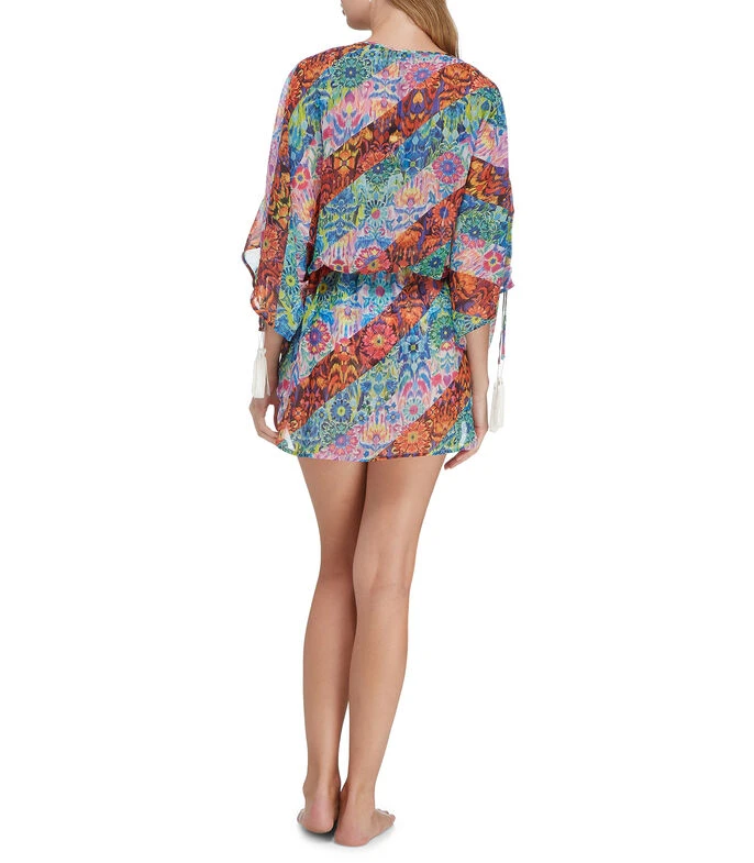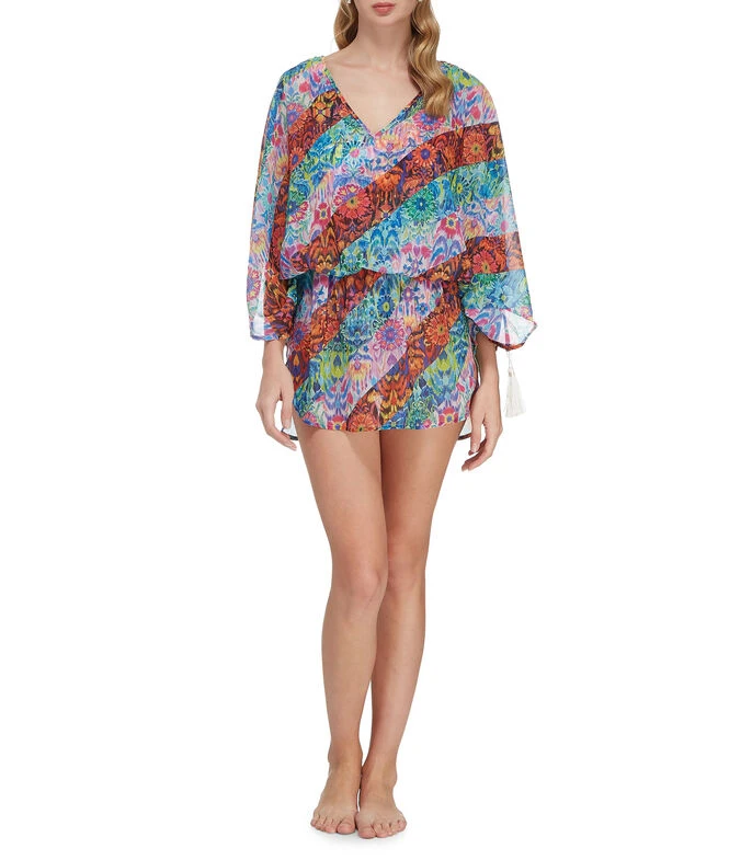 Túnica para playa Kurt Geiger de corte amplio en tejido de punto con diseño de flores en mosaico, sin mangas y cuello V.