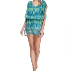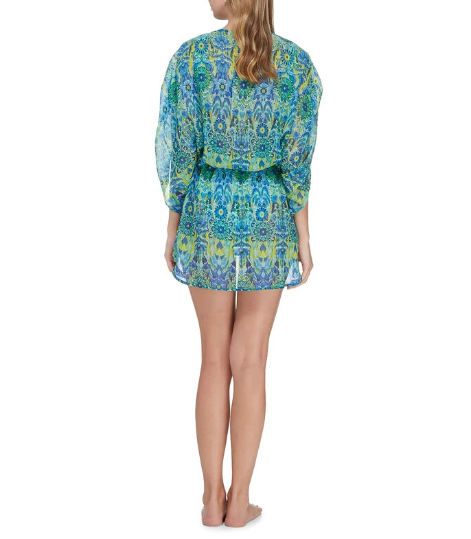 Túnica para playa Kurt Geiger de corte amplio en tejido de punto con diseño de flores en mosaico, sin mangas y escote V.