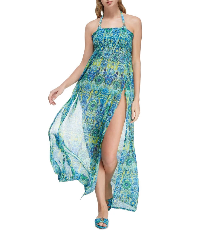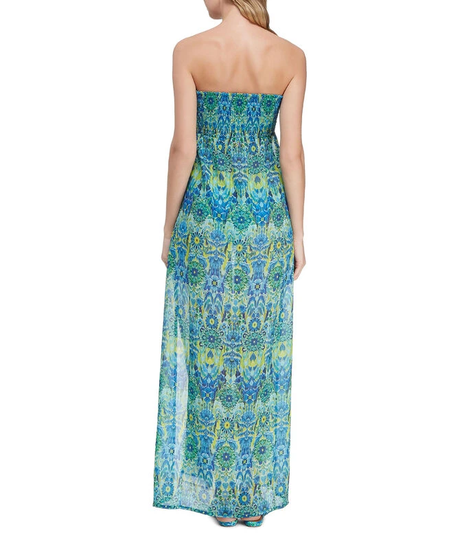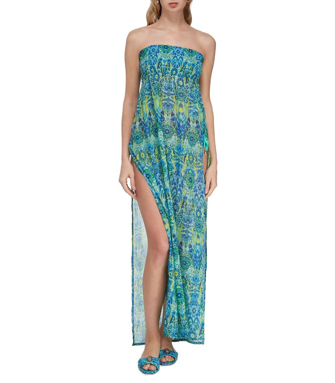 Vestido de playa Kurt Geiger de corte amplio en tejido de punto con diseño de flores, sin mangas y escote strapless.