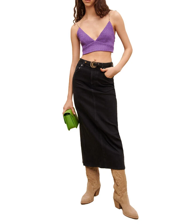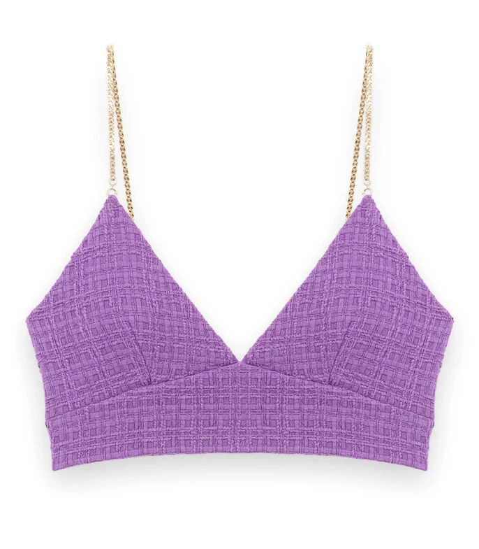 Blusa Maje tipo crop top de corte ajustado con textura, cuadros a tono y tirantes de cadena dorada.