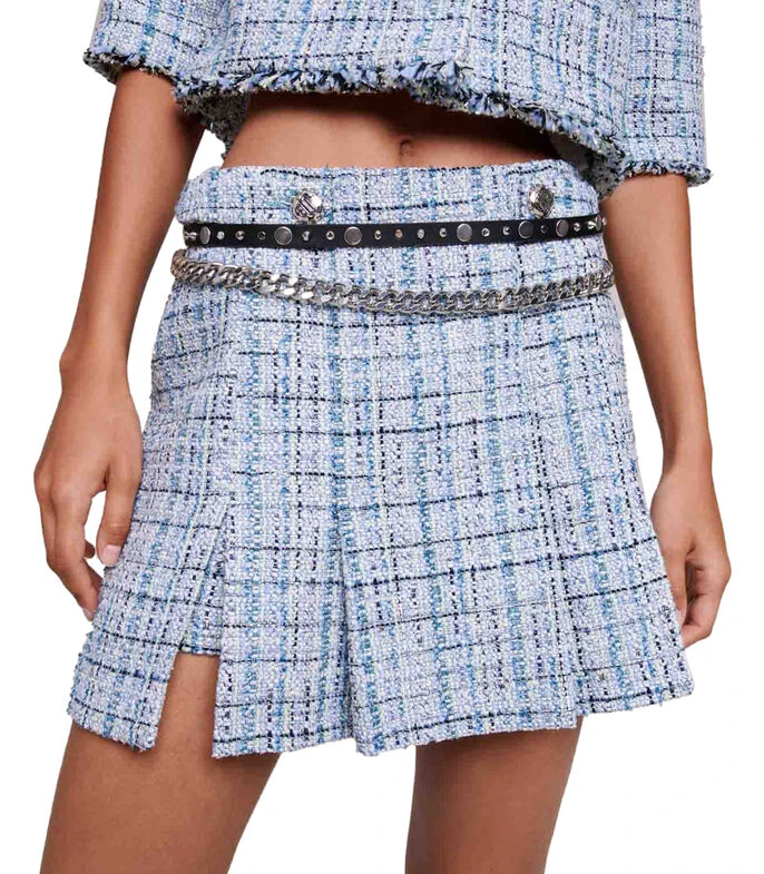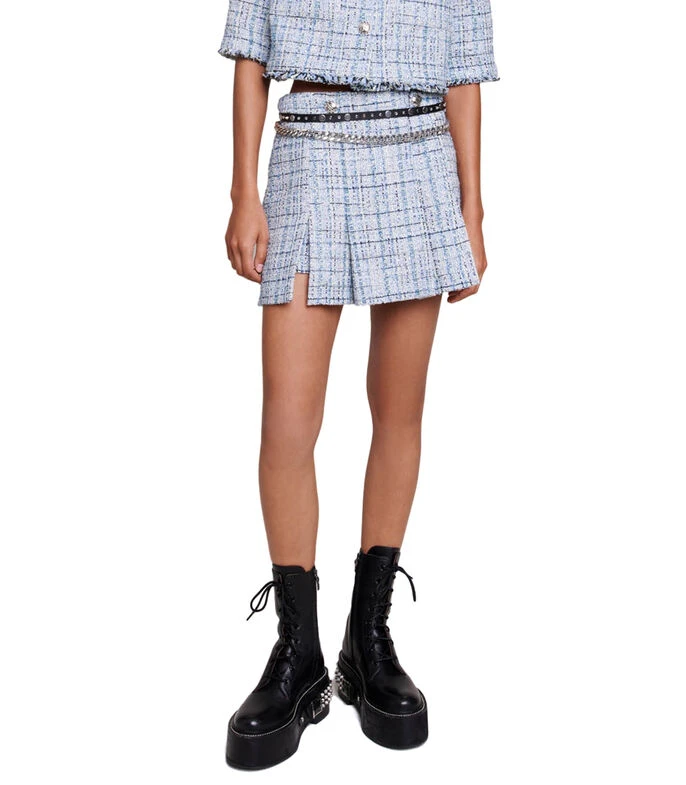 Falda corta Maje de silueta recta en tejido de punto jaspeado con botonadura simulada al frente.