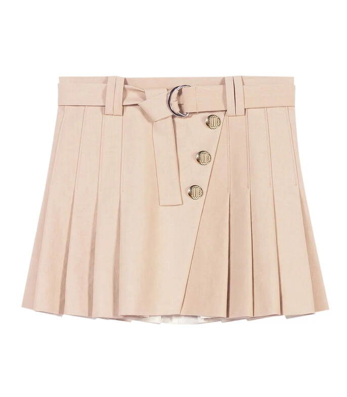 Falda corta Maje de corte recto en tejido de punto liso con trabillas y cinturón desmontable, bolsillos laterales, botonadura en diagonal y caída plisada.