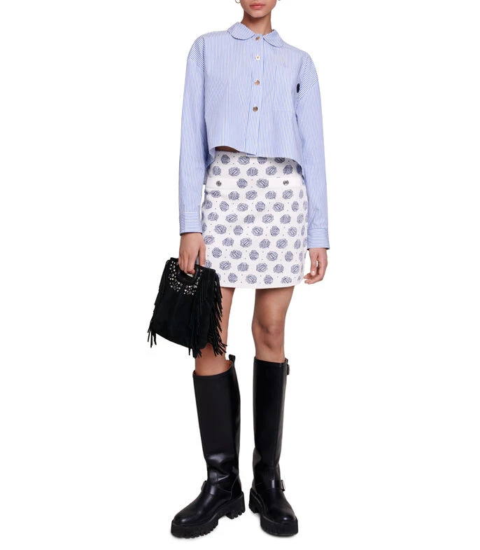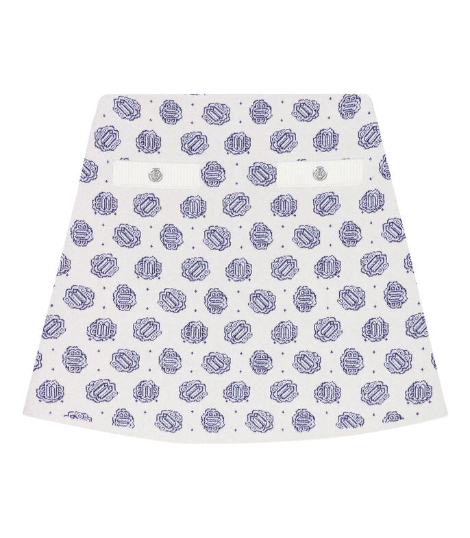 Falda corta Maje de corte recto en tejido de punto con monogram de la marca, bolsillos decorativos frontales en contraste con botonadura y cierre en parte posterior.