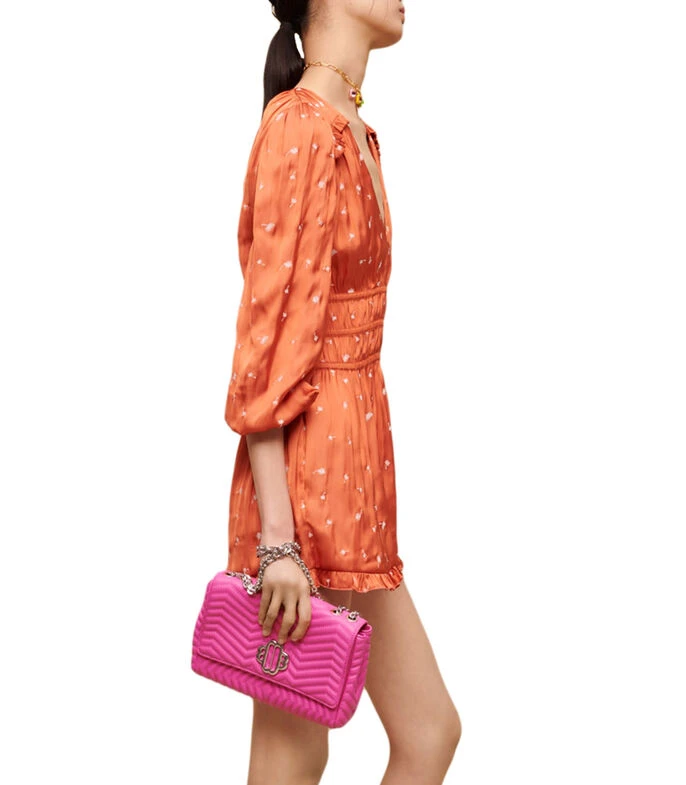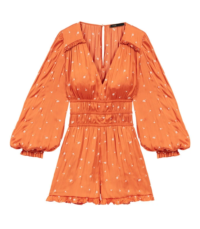 Jumper Maje de corte recto en tejido de punto, acabado satinado, cuello V, detalles decorativos en hombros, costuras en cintura, y manga larga abullonada.