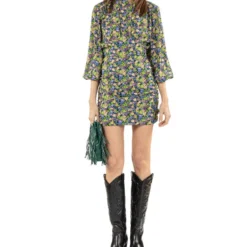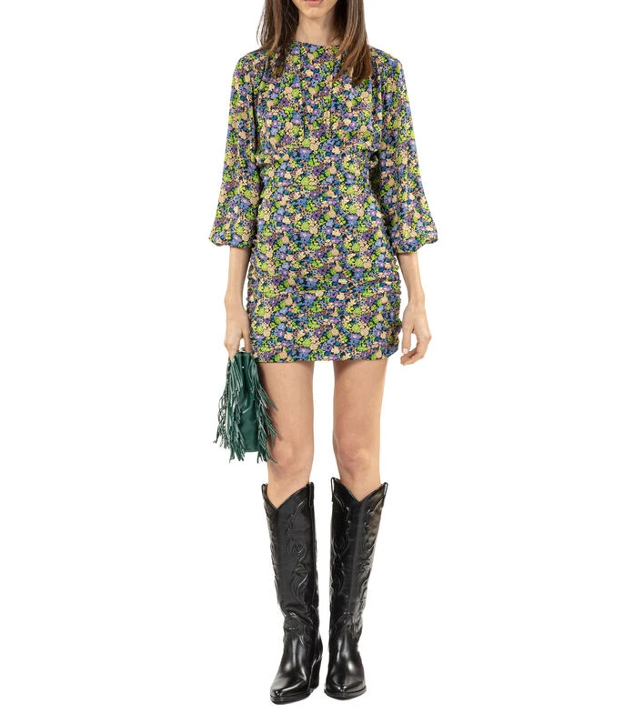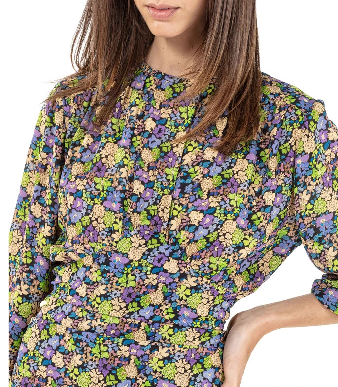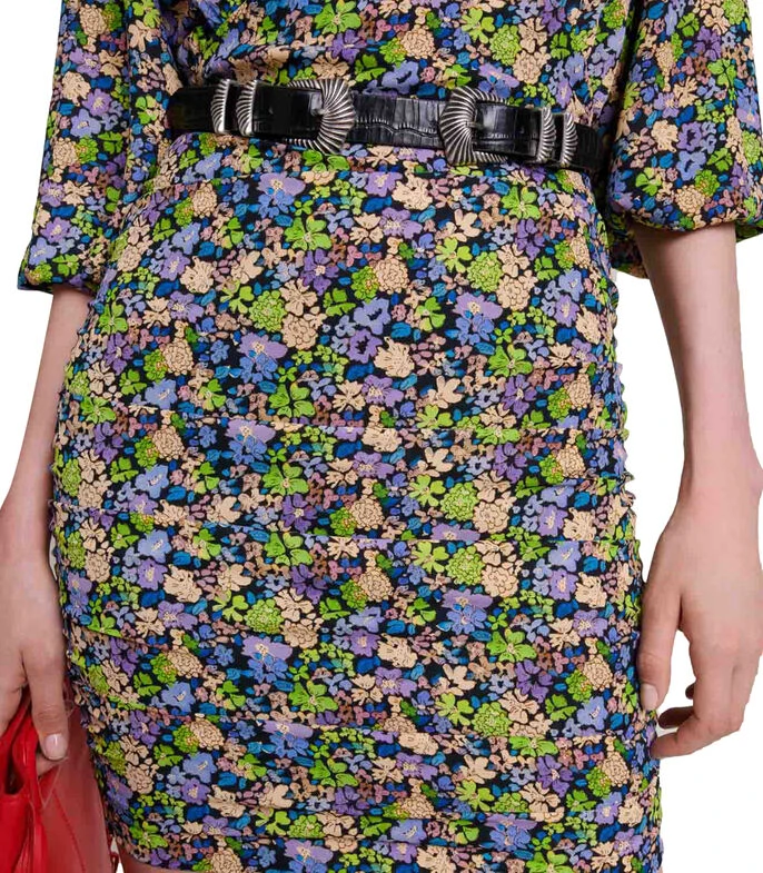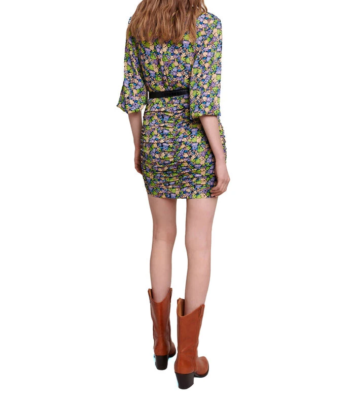 Vestido Maje corto de corte recto en tejido de punto, diseño floral, cuello redondo, detalle de dobleces en parte frontal, manga 7/8 y cremallera en espalda.
