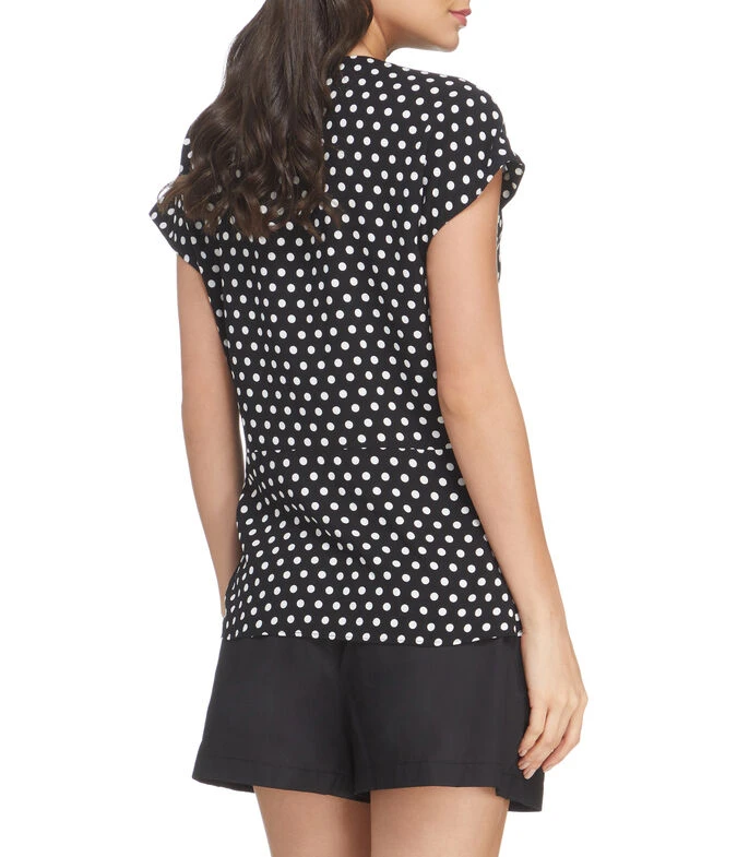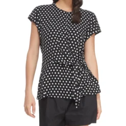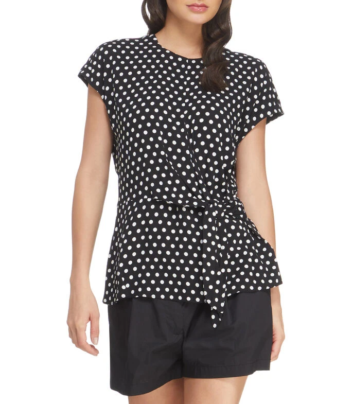 Blusa Michael Kors de corte regular en tejido de punto, cuello redondo, manga corta, polkadots a contraste y nudo decorativo al frente.