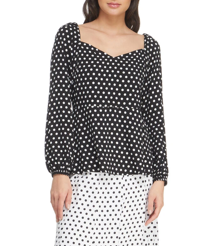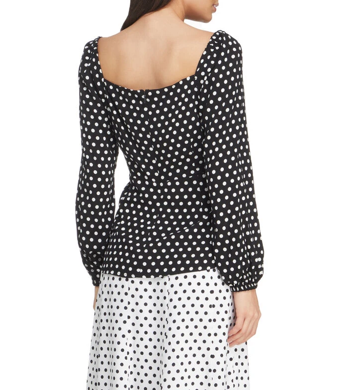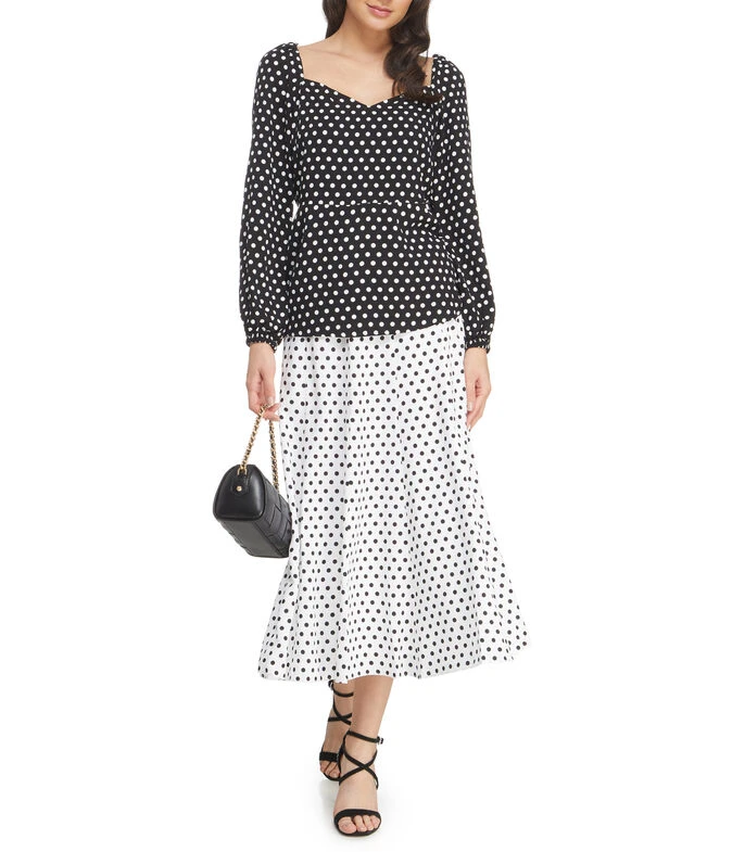 Blusa Michael Kors de corte regular en tejido de punto, cuello V, manga larga con puño simple, polkadots a contraste y espalda descubierta.