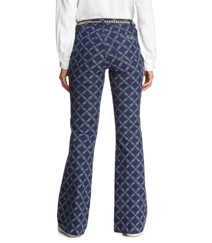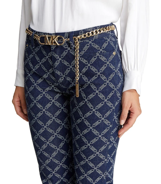 Jeans Michael Kors de corte flared con trabillas para cinturón, cierre de botón con cremallera, diseño de monogram, bolsillos, remaches metálicos y cinturón de cadena.
