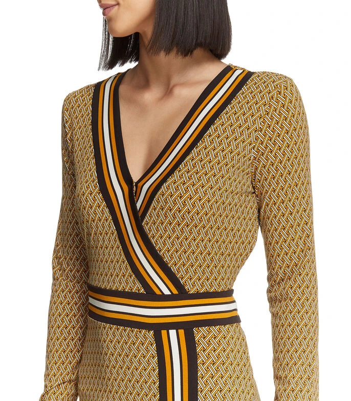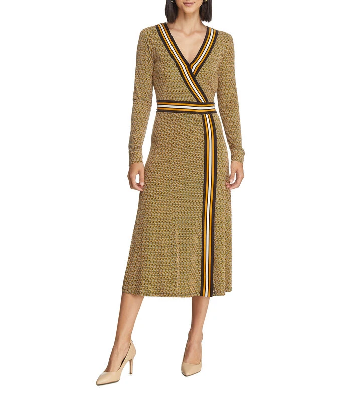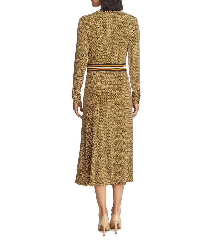 Vestido Michael Kors de corte recto en tejido de punto, diseño monogram, cuello V con detalle en borde y manga larga.
