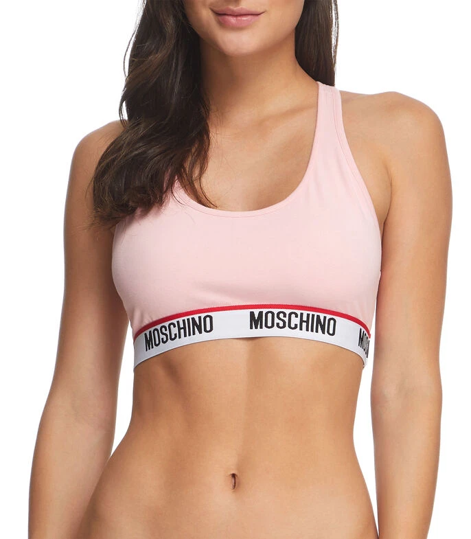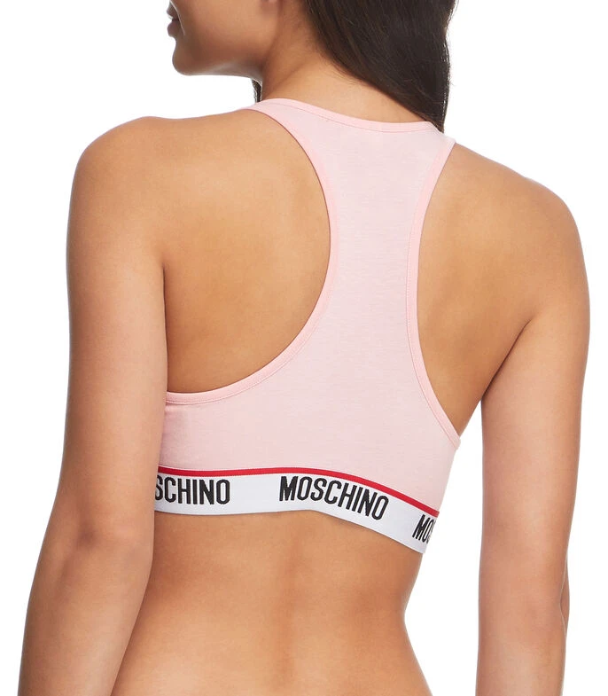 Top sin varilla Moschino en tejido de punto sin copa, tirantes medianos y pretina elástica en parte inferior con nombre de la marca.