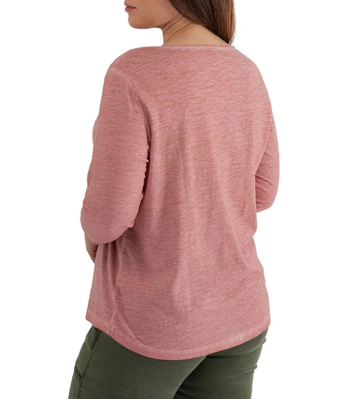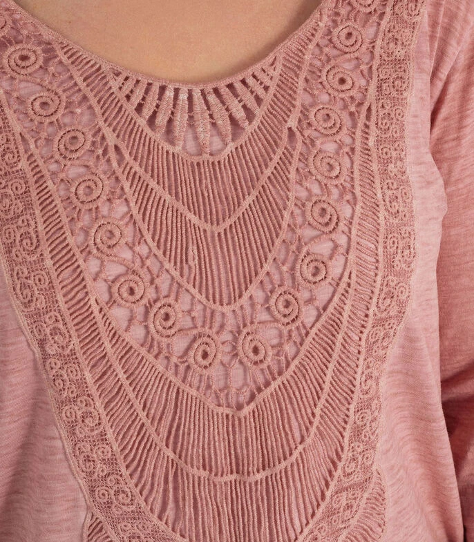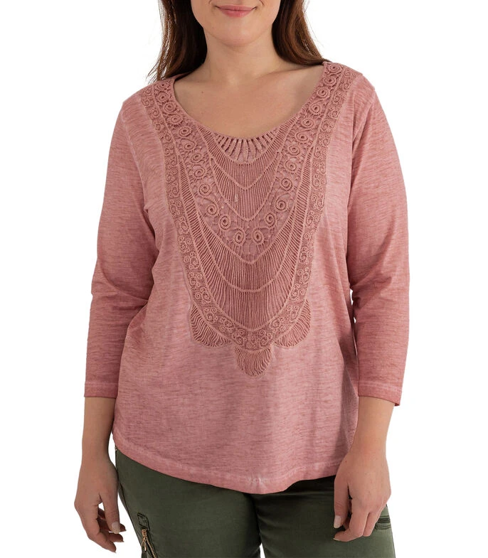 Blusa October de corte recto en tejido de punto con bordado a tono al frente, cuello ovalado y manga 3/4.