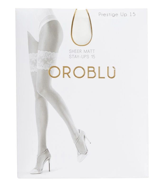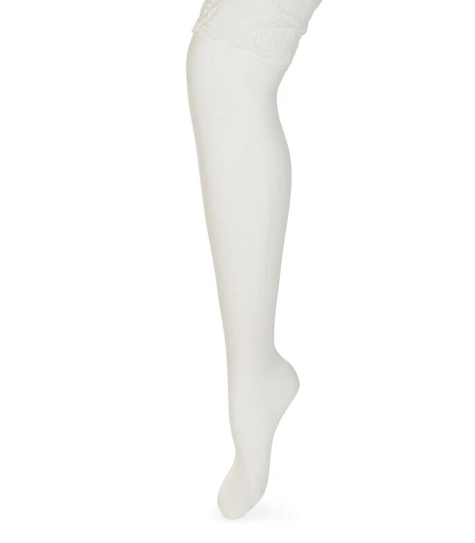 Medias Oroblù en tejido de punto blanco con detalle decorativo tipo encaje en borde superior.