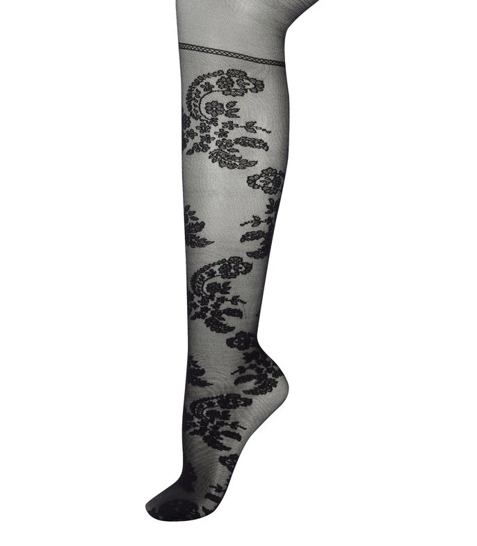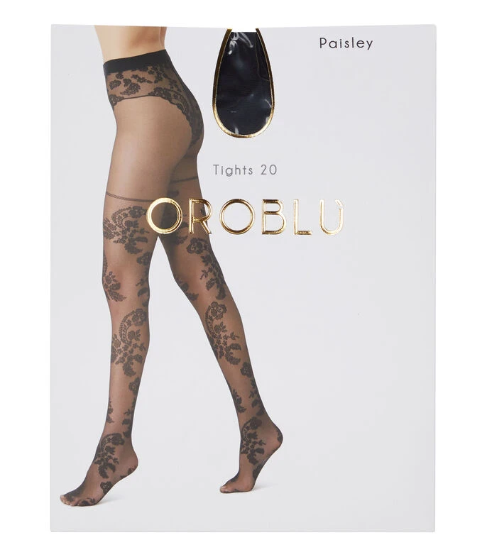 Pantimedia Oroblu Paisley Tights 20; Diseño transparente de 20 deniers con fuelle y efecto de encaje sobre una base de tul. Un delicado motivo “paisley” sube hasta el muslo, creando un sensual efecto de sujeción, luego se detiene y continúa en la zona del calzoncillo. Pantimedia que realza tus piernas, para un look femenino y sensual.