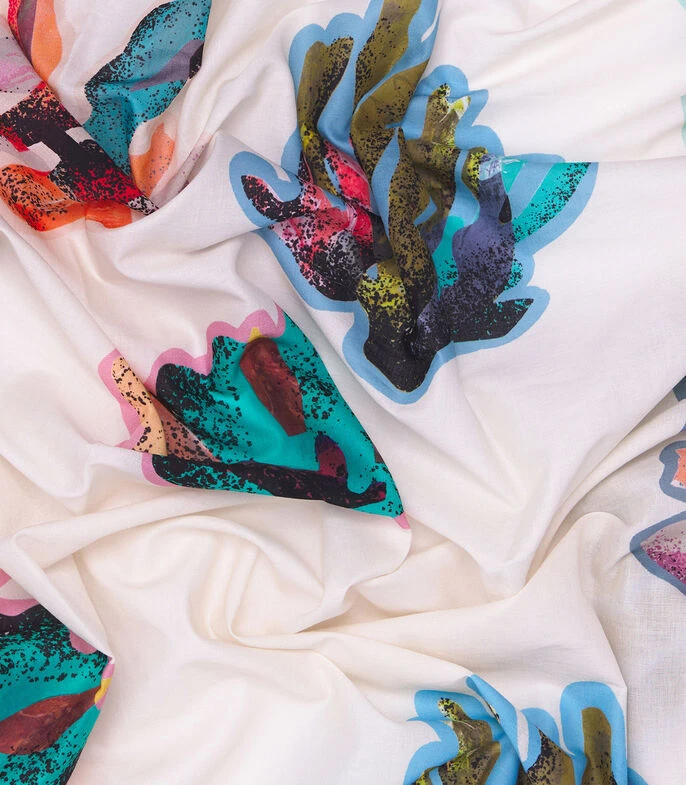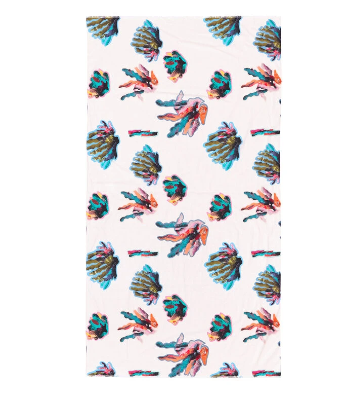 Pareo Bimba y Lola en tejido de punto, estampado coral sobre un fondo a contraste. Su diseño marino y colorido lo convierte en una pieza llamativa y divertida para complementar tus looks veraniegos.
