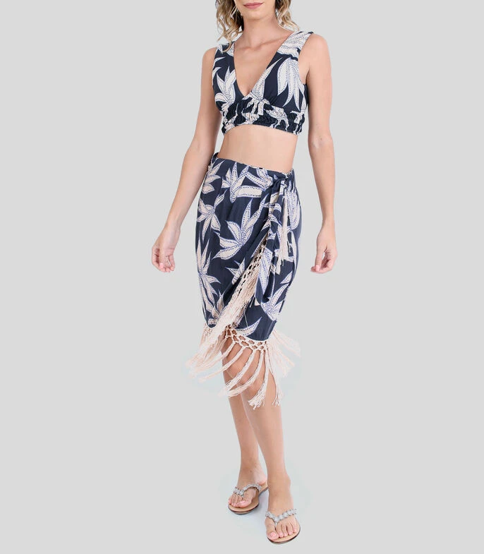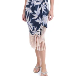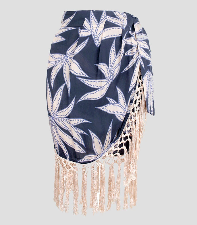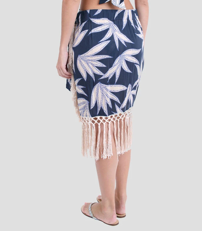 Pareo corto Zingara, de la colección Kentia, con diseño de flores, cintas de anudar en costado y flequillos en bordes inferiores.