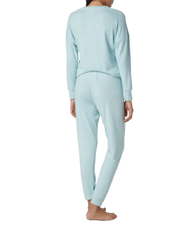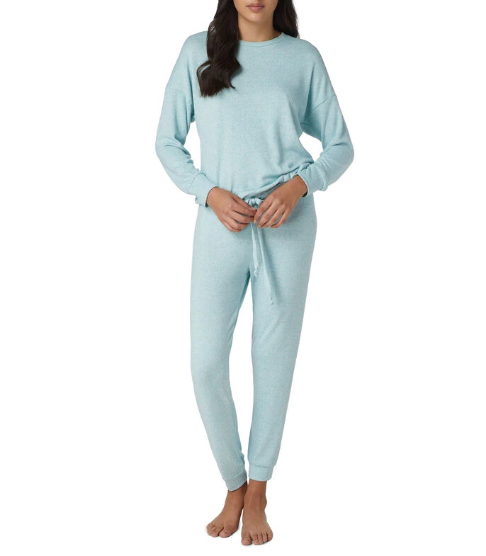 Pijama Mon Plaisir de dos piezas: playera de corte recto en tejido de punto con acabado jaspeado, cuello redondo, manga larga y lazo ajustable en cintura. Pantalón a tono de cintura elástica.