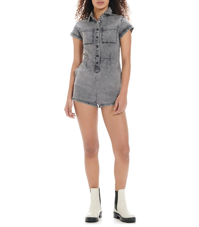 Rumper Unfollow con cuello camisero en denim deslavado. Cierre con botonadura de presión y bolsillos al frente. Manga corta. Cintura con pinzas al frente y elástico en parte posterior.