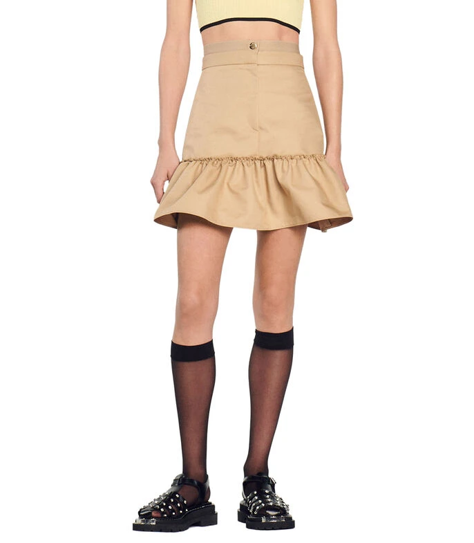 Falda corta Sandro de corte ajustado en tejido plano, botón metálico, cremallera y detalle de olanes en terminación.
