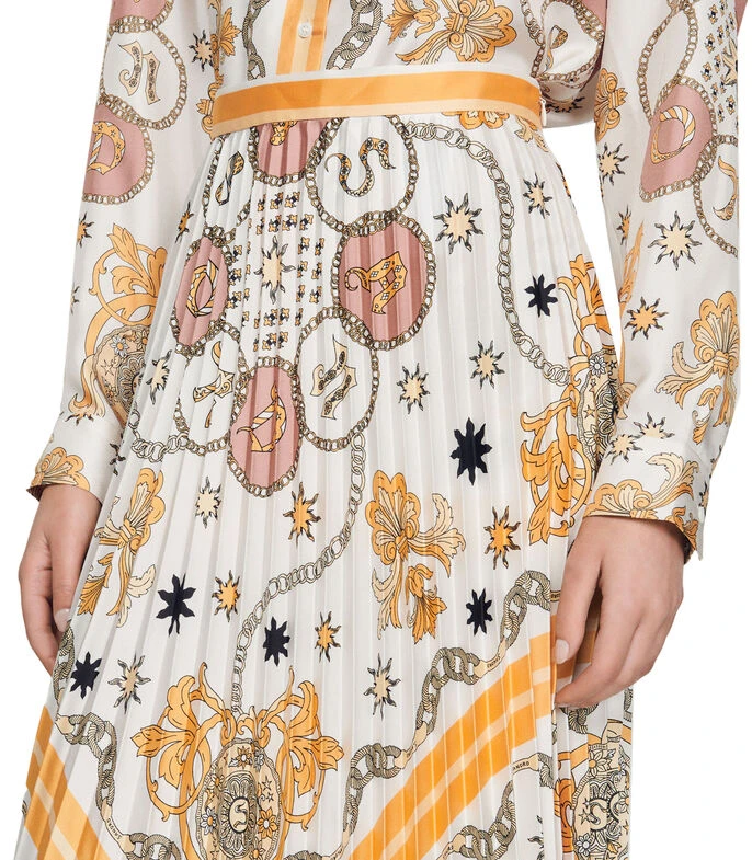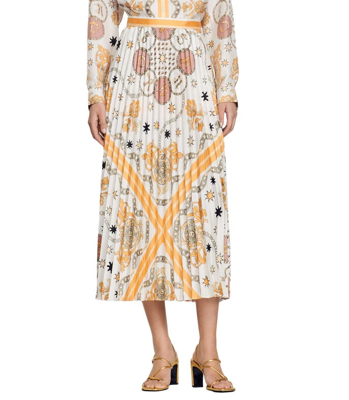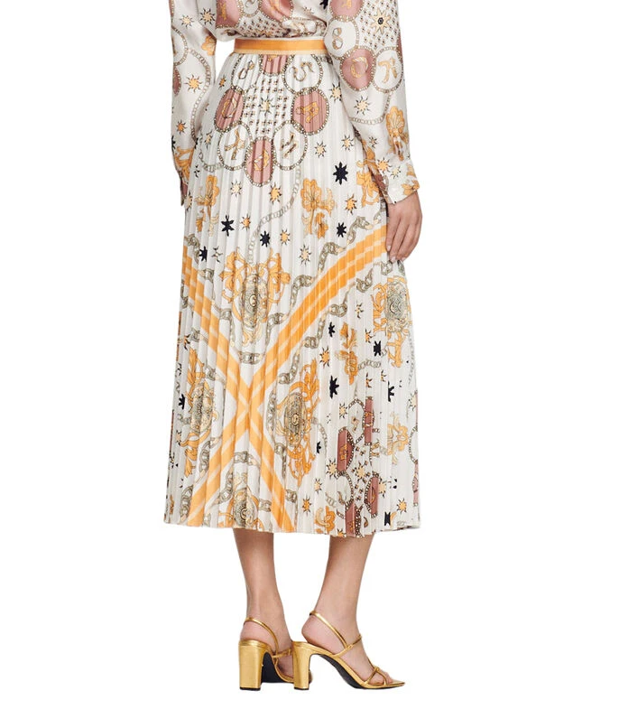 Falda larga Sandro de corte recto en tejido de punto con estampado abstracto alusivo al modelo y plisado en cuerpo.