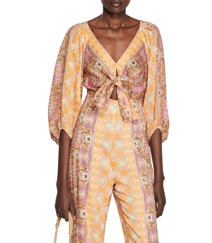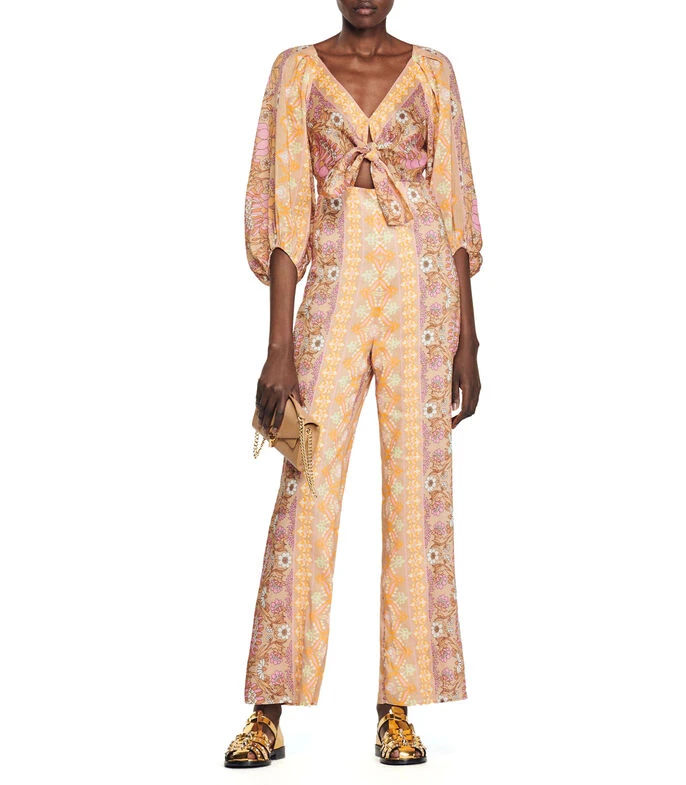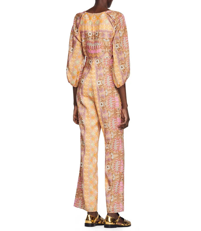 Jumpsuit Sandro de corte recto en tejido de punto, estampado paisley, abertura al frente con moño decorativo en pecho.