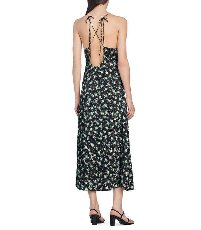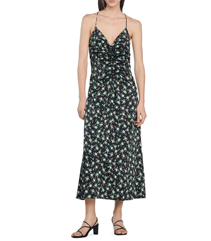 Vestido Sandro largo de corte recto en tejido de punto con flores, cuello «V», tirantes ajustables y abertura en espalda.