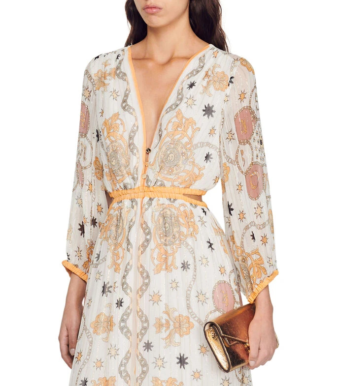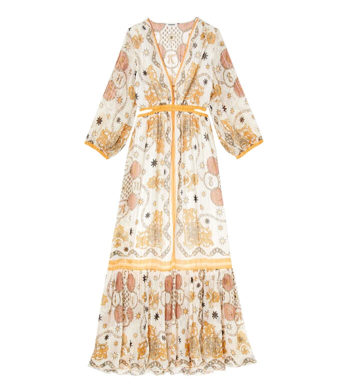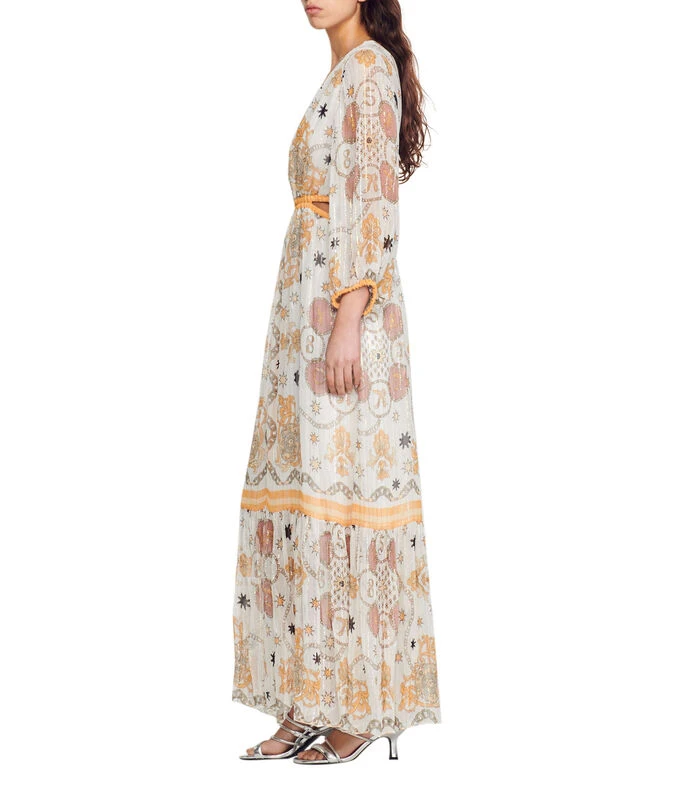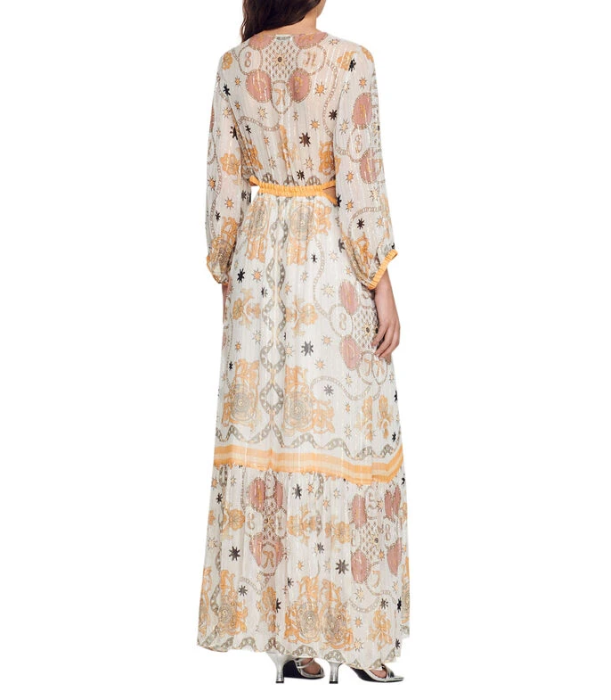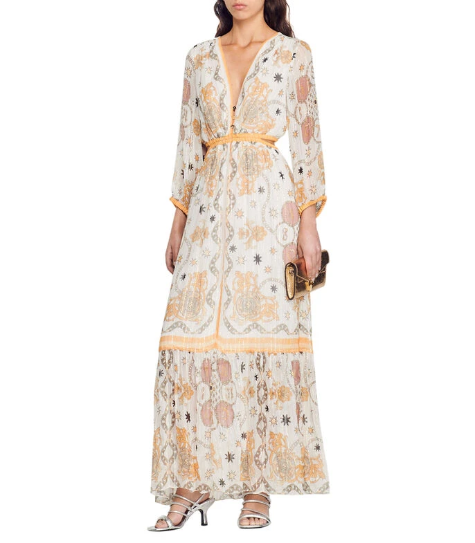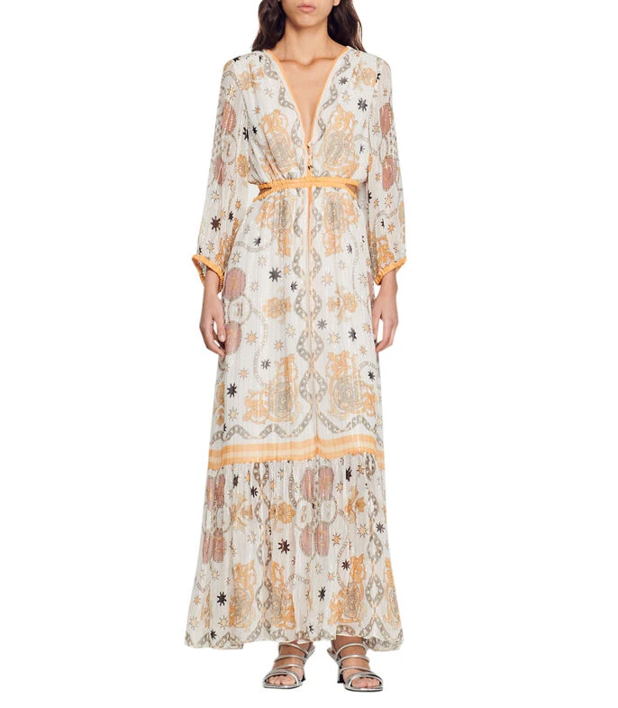 Vestido Sandro Maxi de corte recto en tejido de punto con estampado alusivo al modelo, cuello V, sutil abertura en laterales y manga larga.