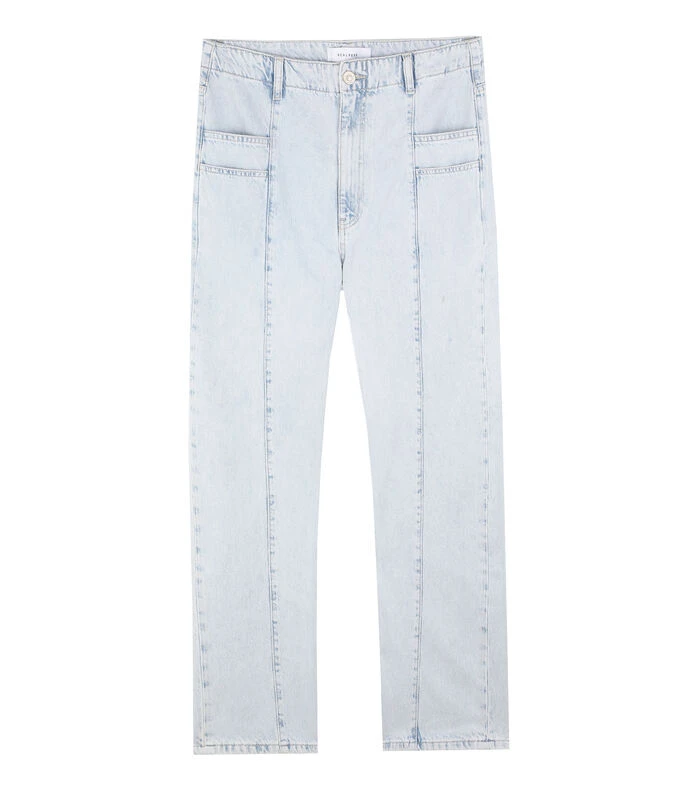 Jeans Scalpers de corte regular con sutil diseño deslavado, botón metálico, pespuntes a contraste, detalle decorativo de líneas de quiebre y bolsillos a los costados.