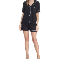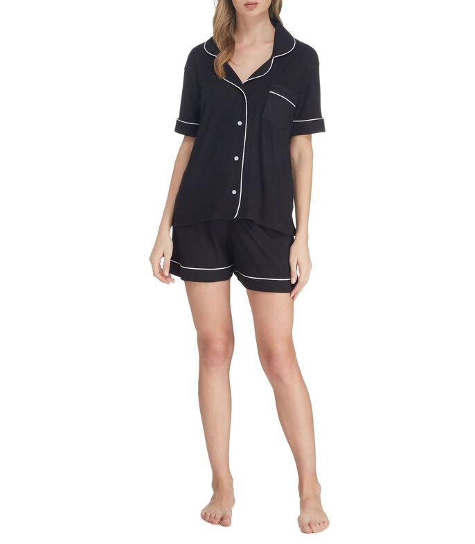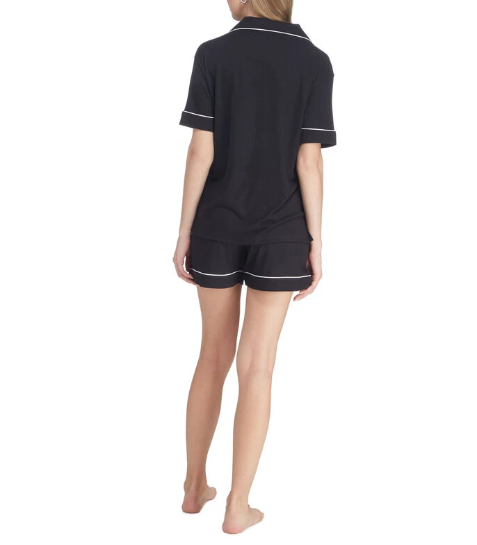 Set UNWIND by Epsilon de dos piezas, con camisa de corte recto en tejido de punto, solapa en cuello V, manga corta, líneas a contraste, bolsillo tipo parche y cierre de botones. Short con pretina elástica.