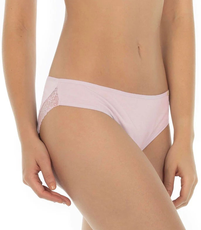 Bikini Skiny en tejido de punto liso por delante con detalle tipo encaje en los bordes traseros. Nombre de la marca enfrentes al costado. No dejes de lado el toque femenino y siéntete siempre coqueta.
