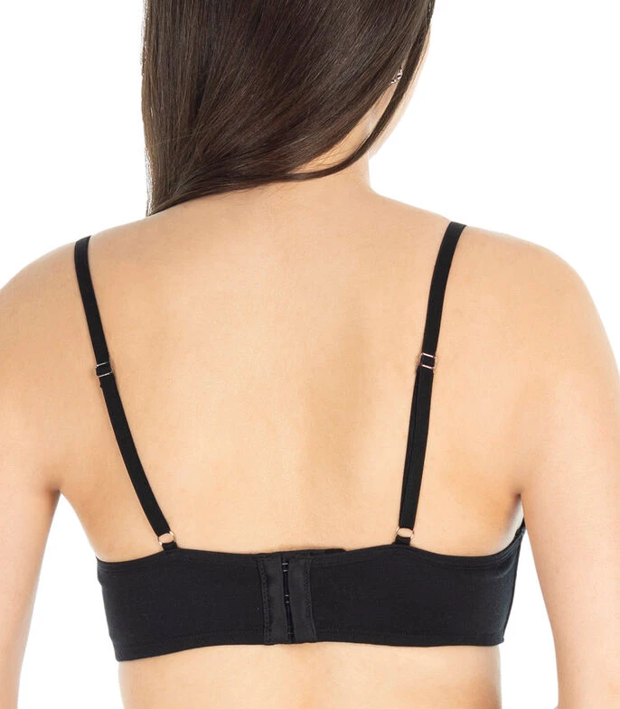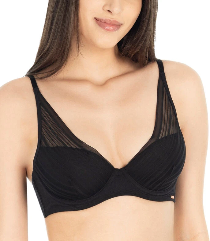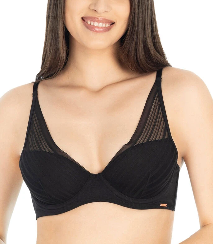 Brasier Skiny en tejido plano con diseño sólido, detalle translúcido en copas, tirantes ajustables y espalda clásica.