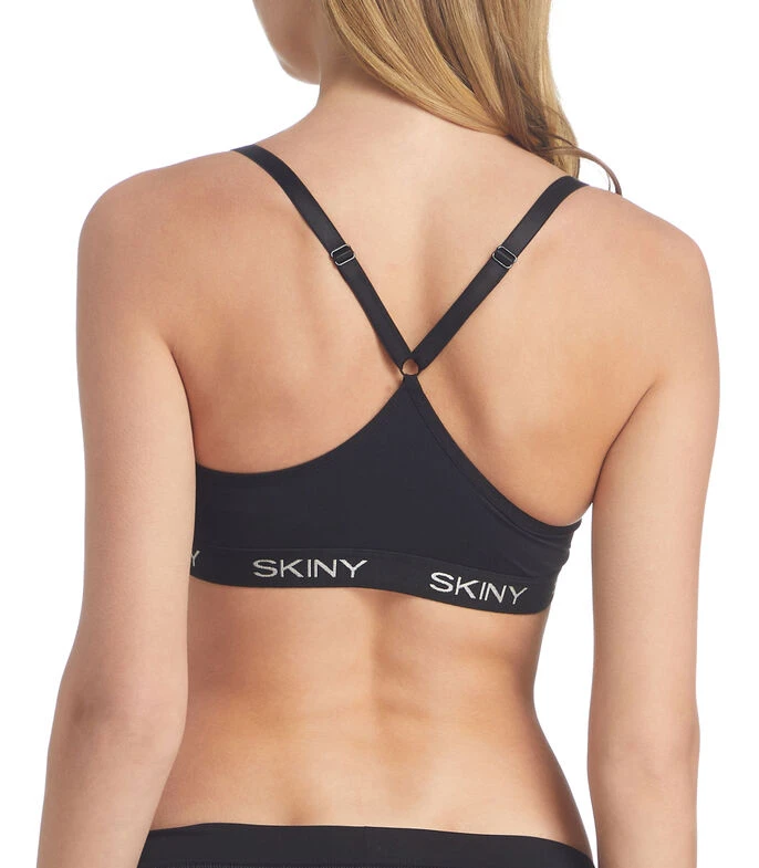 Brasier sin varilla Skiny en tejido plano con copa suave, tirantes delgados y pretina elástica con monogram a tono.