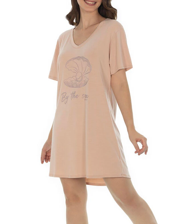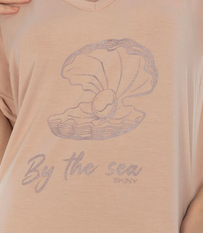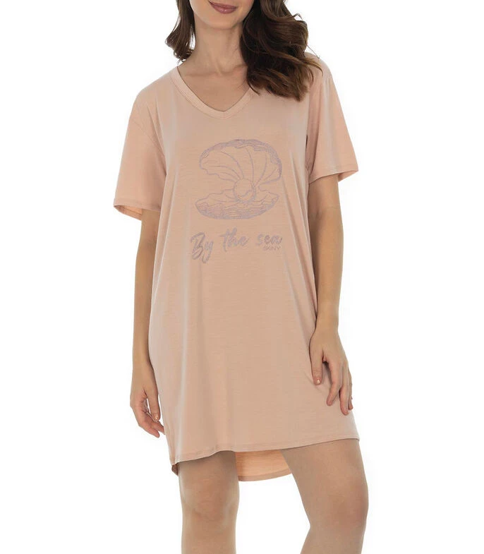 Camisón Skiny de corte recto en tejido de punto con cuello redondo, estampado de concha marina sobre fondo ligeramente jaspeado.
