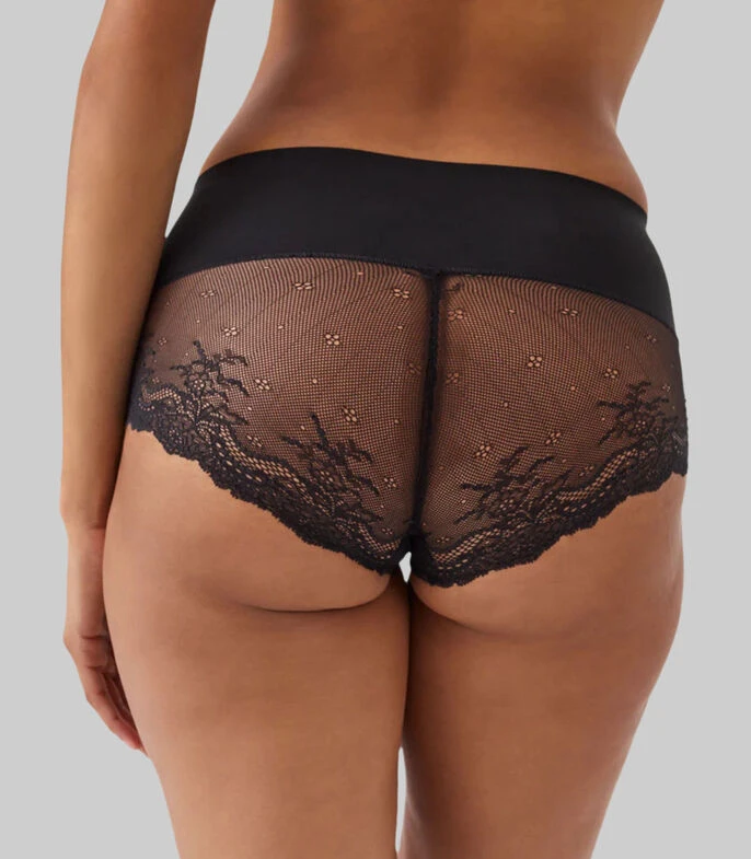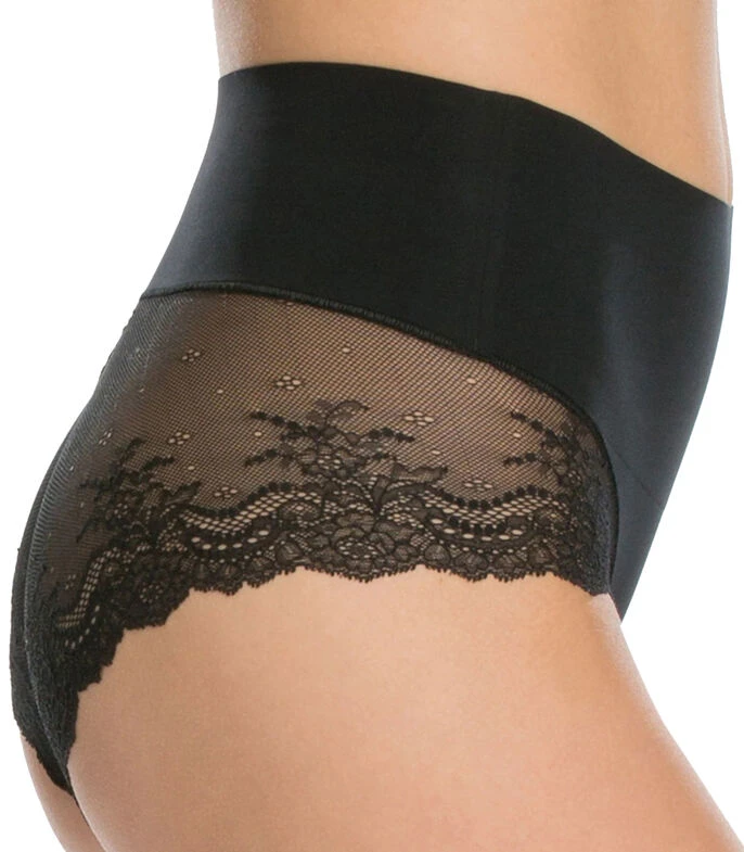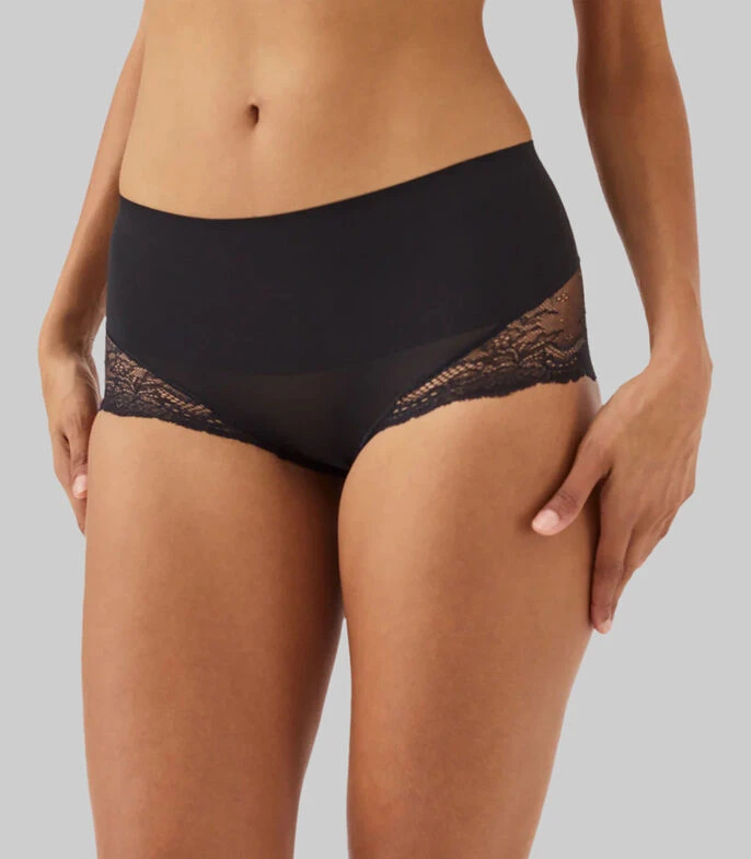 Bikini tipo hípster Spanx Undie-tectable Lace en tejido de punto con encaje; Este bikini fue diseñado para brindarte una apariencia completamente suave debajo de la ropa. La pretina adherida suaviza el abdomen, mientras que los bordes de suave encaje sin elástico no se notan sobre la ropa, lo que lo hace verdaderamente indetectable.