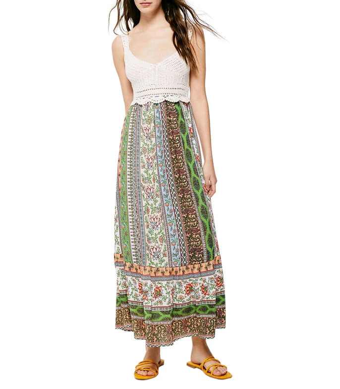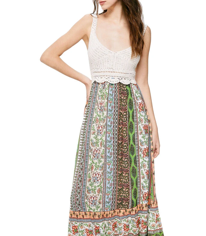 Vestido Springfield Midi, de corte A en tejido de punto, cuello V sin mangas con textura tipo crochet, falda inferior con estampado Patchwork a contraste y volante inferior.