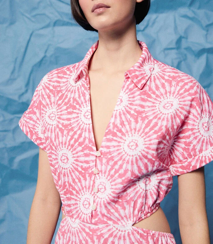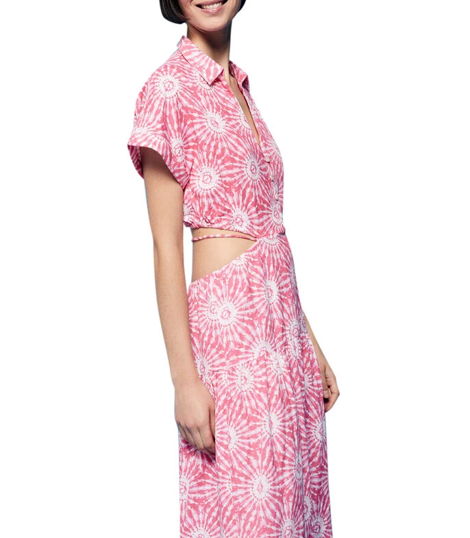 Vestido Springfield de corte A en tejido de punto, cuello V, media botonadura a contraste, manga corta con doblez en borde, abertura en cintura con cintas delgadas, falda con bloques y estampado a contraste.