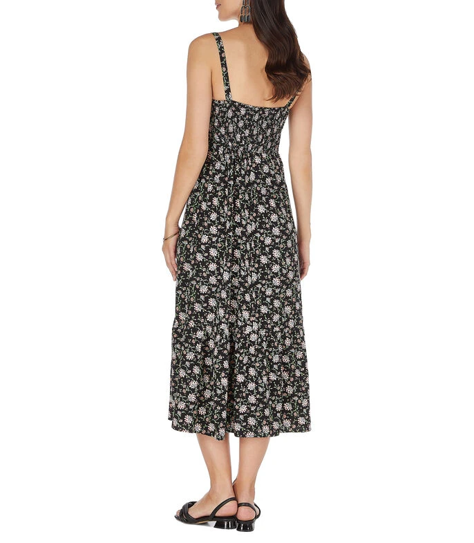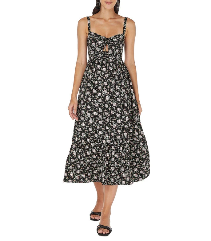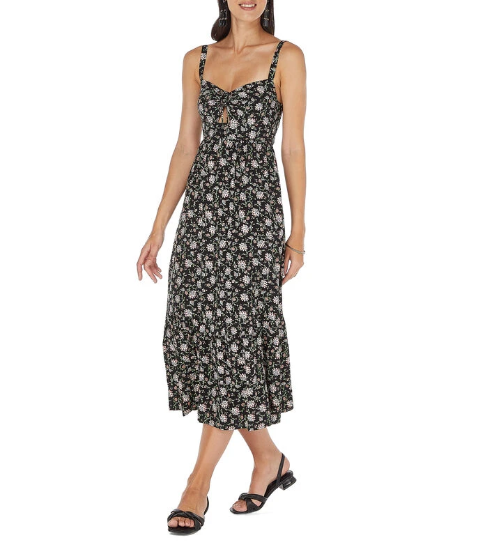 Vestido Springfield midi de corte recto en tejido de punto con estampado floral, nudo en pecho, elástico en espalda y tirantes.