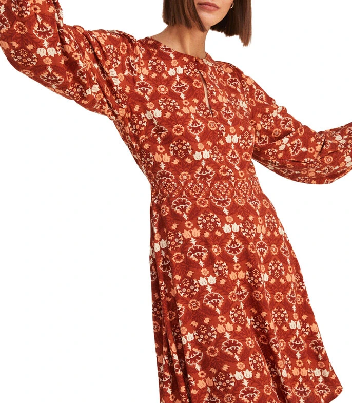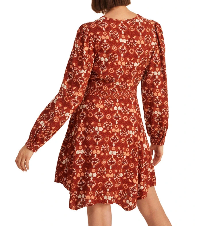 Vestido mini Springfield de corte evasé en tejido de punto con estampado floral, mangas abullonadas y botón en cuello.